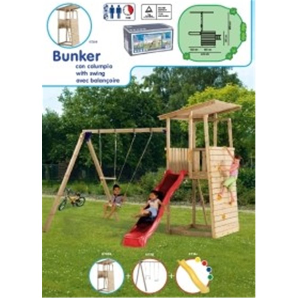 Torre de madera tratada especial para exterior a una altura, con zona de escalacion y tejado de madera en medidas 160 cm x 160 cm, con escalera de acceso a primer piso  de 70 cm., tobogan ondulado de 1,92 cm de largo y columpio lateral de 240 cm x 285 cm. con  un asiento y un trapecio de anillas.