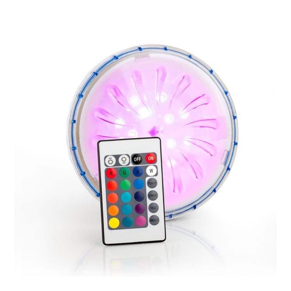 Proyector LED COLOR para piscinas elevadas. Iluminación con tecnología Led de bajo consumo. Alimentado mediante 3 pilas AA (no incluidas). Incluye mando a distancia, que permite el apagado/encendido y el cambio de color de la iluminación. Mando no sumergible. Fácil instalación. El reverso del proyector dispone de un imán que permite colocarlo fácilmente en paredes de acero rígidas. Se puede colocar en paredes de piscinas elevadas con liner plástico con un grosor máximo de 5 mm. Incluye chapa de acero para situar por la parte exterior de la piscina para crear un cierre magnético.
