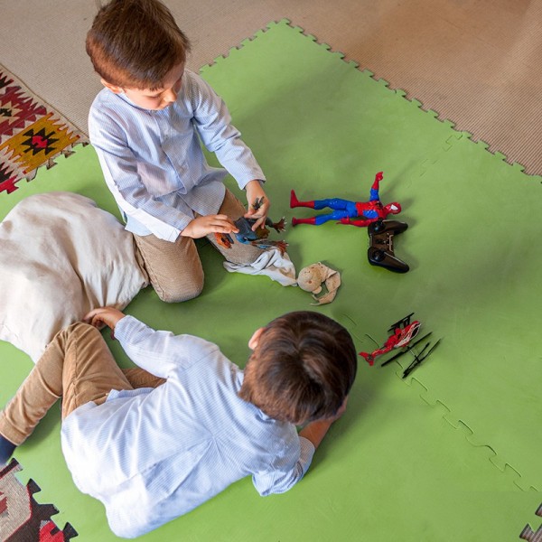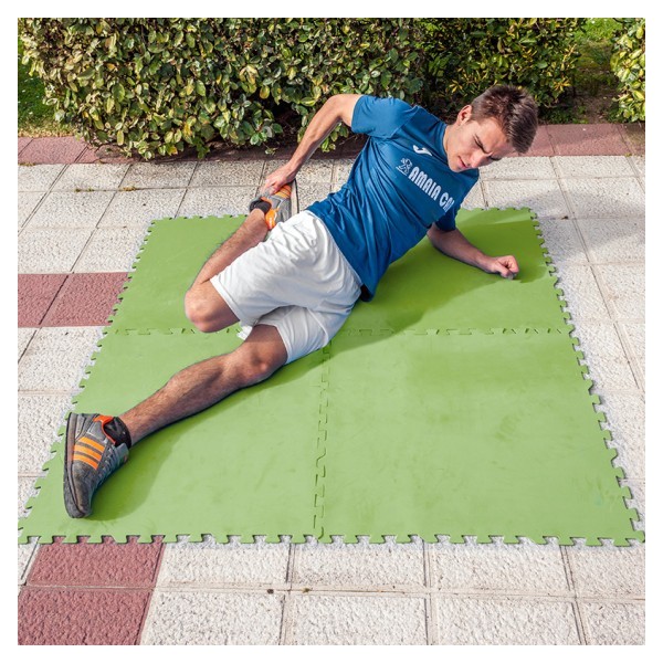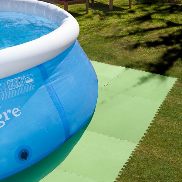 Material protector de suelo de piscinas elevadas en set de 9 piezas tipo puzle en color verde.