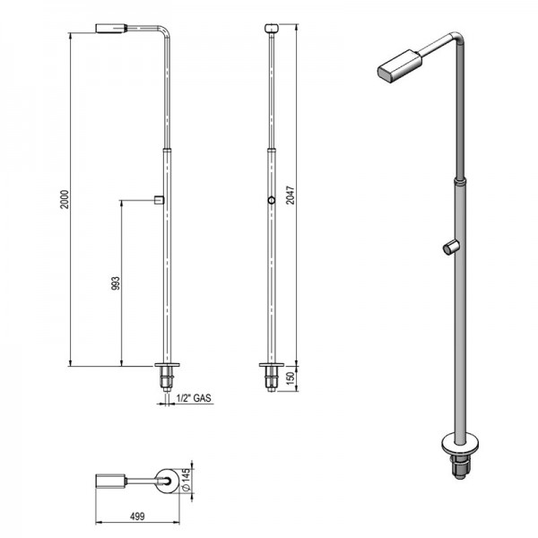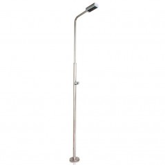 Ducha exterior en acero inoxidable de estética minimalista para piscinas y jardines.