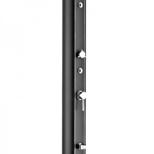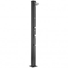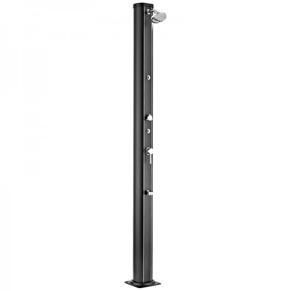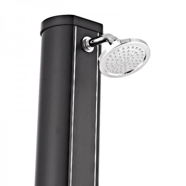 Esta ducha solar está fabricada en aluminio negro. Poste de ducha y rociador en forma redonda con un elegante y detallado diseño.