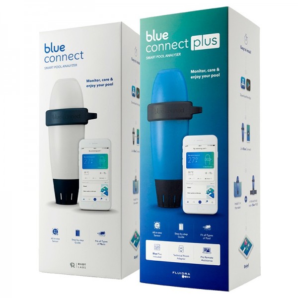 Blue Connect Plus Gold: versión para profesionales de las piscinas que incluye Blue Connect y su aplicación móvil con características avanzadas, Blue Fit 50 (adaptador que permite fijar el Blue Connect en la tubería del local técnico), y acceso a la plataforma profesional para el seguimiento de múltiples piscinas. Compatible con piscinas y spas que usan cloro, bromo y cloración salina.