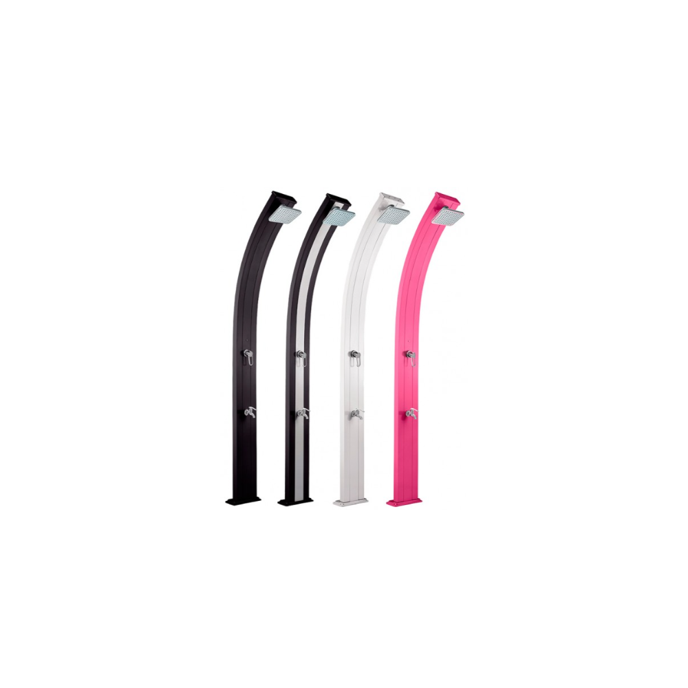 • Ducha solar de diseño fabricada en aluminio que con una sola toma de agua fría, permite el calentamiento de esta mediante un depósito acumulador de 30 litros de capacidad, aprovechando la energía solar.