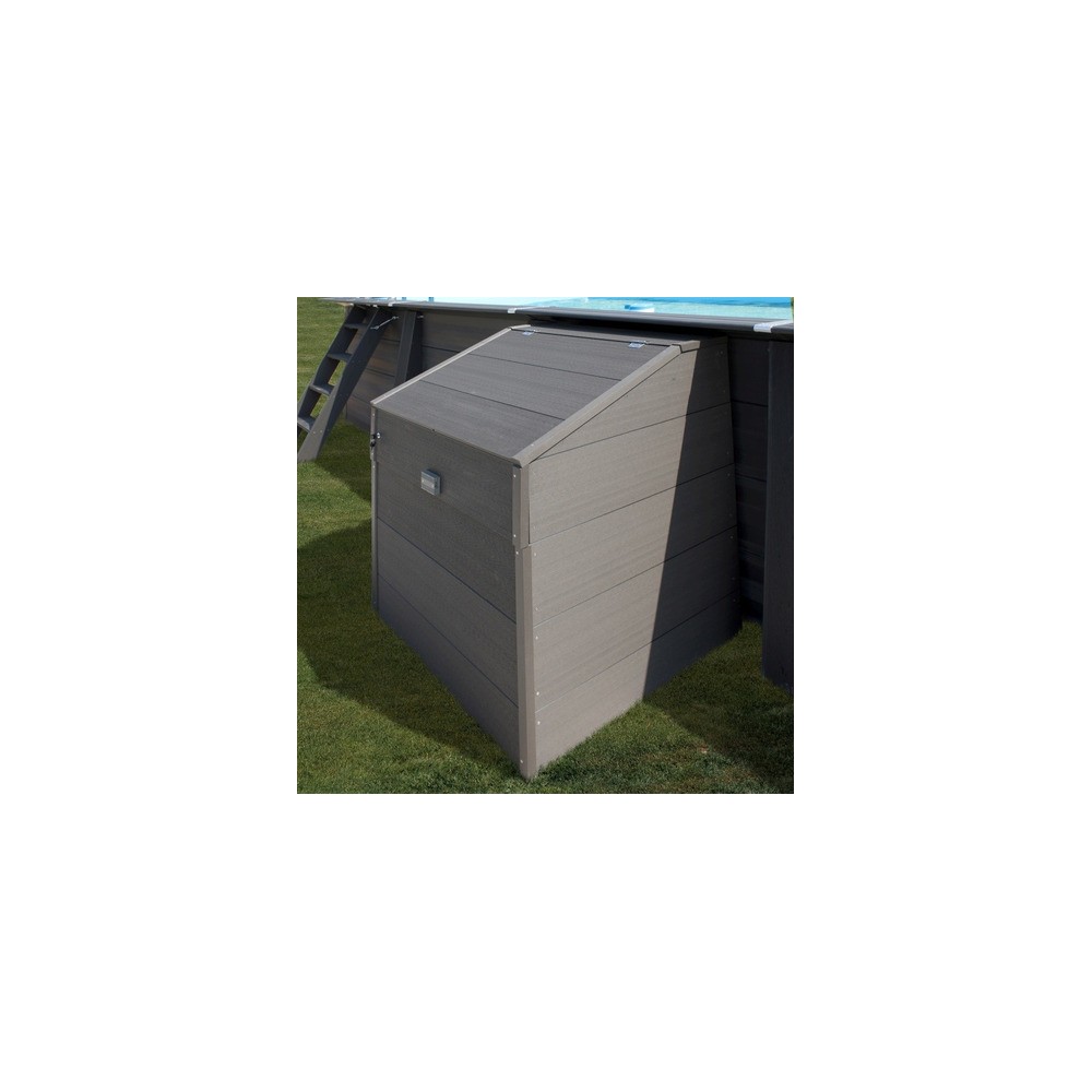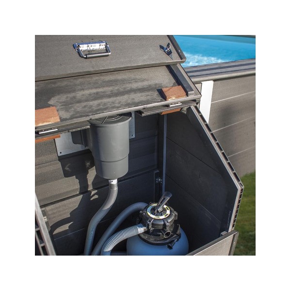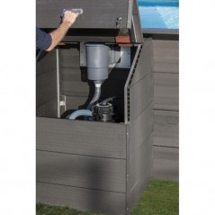 El local técnico se puede colocar adosado a la piscina (se adapta a la altura y al skimmer de las piscinas de composite) o a una pared.