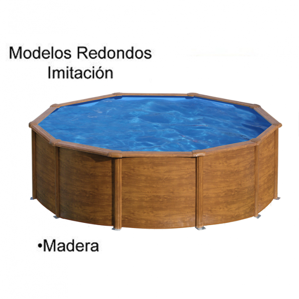 PR358 GF W - Piscina redonda de chapa de acero lacada en imitacion madera en medida 350x132 de altura, con liner liso color azul  en 40/100 de espesor, skimmer standar y boquilla de impulsion,