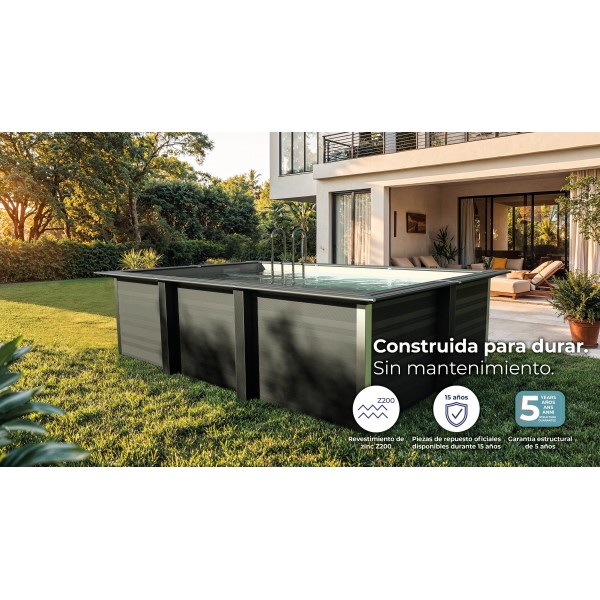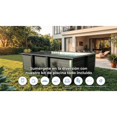 Piscina rectangular de 466X326X124 con paneles de composite , liner liso azul 60/100, escalera inox y composite, filtracion 4.000 l/h, skimmer y manta protectora de suelo.