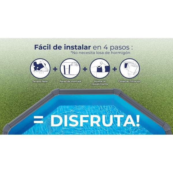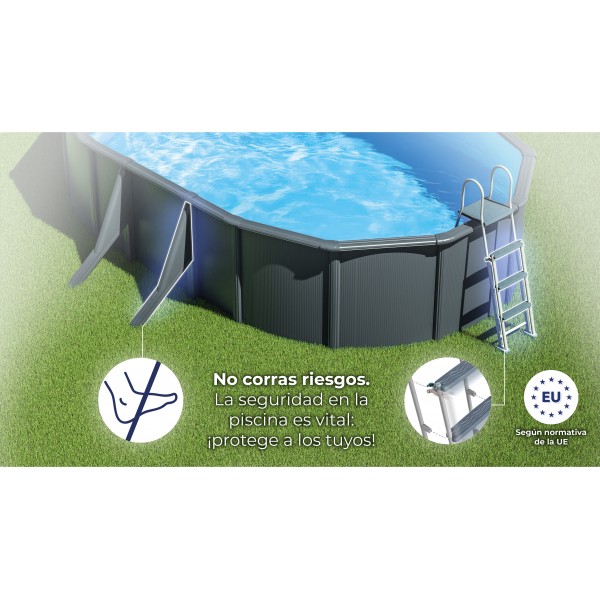 500x300x120- Piscina ovalada con patas de chapa de acero lacada imitacion grafito, liner azul 40/100, escalera tijera, filtracion de arena 4000 l/h Características de la Piscina Gre KIT5000GF: Forma: Ovalada. Medidas: 610x375 cm. Altura: 120 cm. Espacio necesario: 770x595 cm. Capacidad: 15.550 litros. Contrafuertes: 6 (tres a cada lado). Sistema Depuración: Filtro de Arena de 4 m3/h con arena incluida. Escalera de Tijera de Seguridad: acero galvanizado y lacado en blanco con 6 peldaños y con frontal extraible. Estructura: chapa, perfiles y columnas de soporte lateral de acero galvanizado, decorado, con tratamiento anticorrosivo (fosfatación) y laminados en frío. Perfiles: Perfilería de acero imitación grafito. Horizontal 15 cm y vertical 12 cm. Protectores de inyección: Aparte de la protección dan un diseño más elegante. Liner: PVC color azul 40/100, con sistema overlap. tratamiento anti-ultravioleta (retrasa el envejecimiento del PVC). Skimmer: de boca grande y con boquilla de retorno. Incluye los tubos de conexión a la depuradora. Peso: 288 Kg Fabricante: Piscinas Gre. Garantía en partes metalicas: 4 años. Garantía enresto de componentes: 2 años.