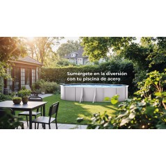 610X375X132 Piscina ovalada con patas , liner liso azul 40/100, escalera de plataforma de acero lacada, filtracion 6000 l/h, skimmer americano y tapiz protector de suelo.