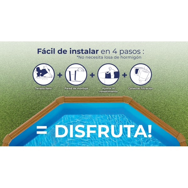 Pared: Chapa laminada en frío con tratamiento de galvanización, fosfatación, imprimación decorada y lacado. Perfilación vertical de la misma para la obtención de una mayor resistencia. Troquelada para skimmer y válvula de retorno del agua.