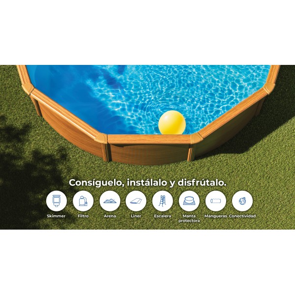 460X132 Piscina redonda imitacion madera, liner liso color azul 40/100, escalera de plataforma de acero lacada con peldaños y plataforma color madera, filtracion 6000 l/h, skimmer americano y tapiz protector de suelo.